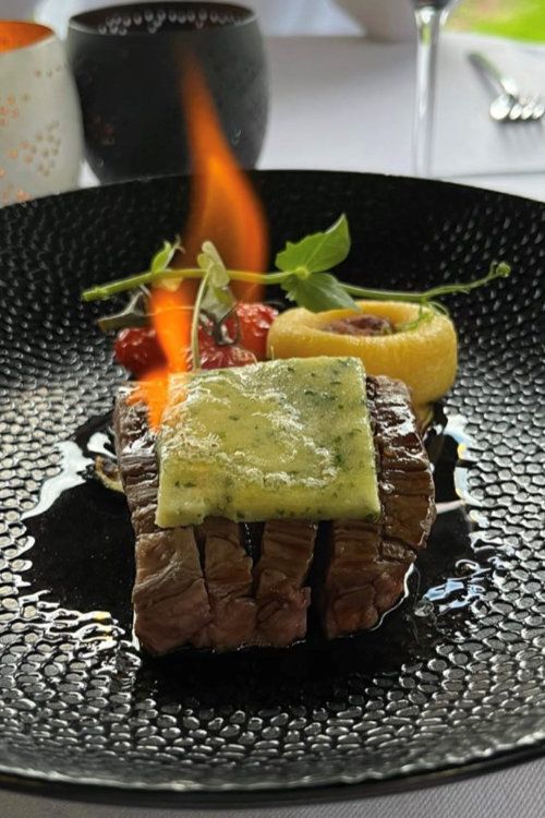 Runderbavette met kruidenkorst geflambeerd aan tafel, jus van rook & zwarte knoflook, polenta-taartje en gepofte cerise tomaat