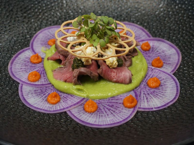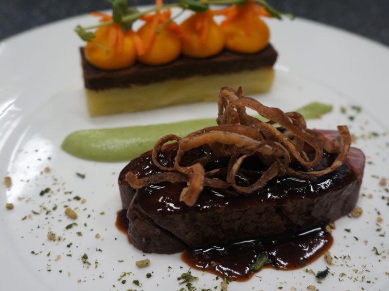 - USA flanksteak met rode port, zwarte knoflookjus en gefrituurde uitjes