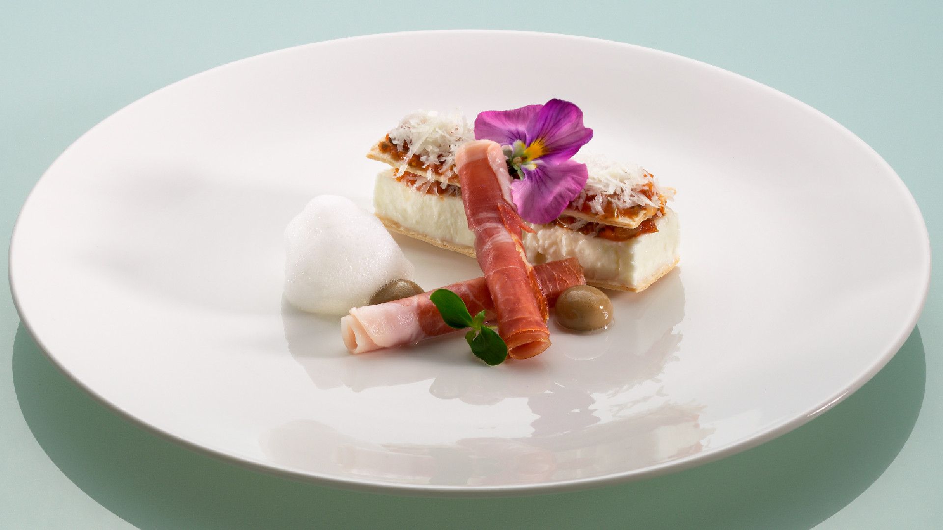 - Crôstini runderstoofvlees, USA flanksteak met sjalot-jus en schuim van Parmezaan